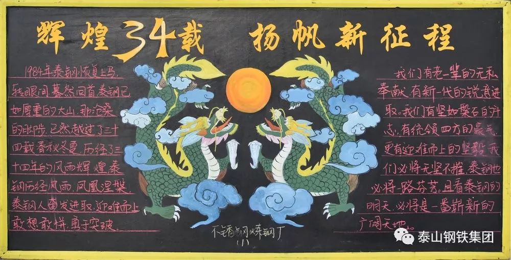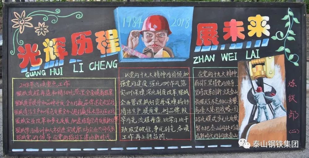 但是,泰山钢铁集团的钢铁汉子们不仅能百炼钢,亦能绕指柔!今年4月20日是泰山钢铁集团恢复生产34周年纪念日,为庆祝这一历史时刻,回顾和讴歌34年的创业历程,自4月18日起,泰山钢铁集团开展了黑板报展评庆祝活动。来自分厂、部室的钢铁汉子们纷纷用手中的画笔为这幸福的日子粉刷彩色的祝福……
