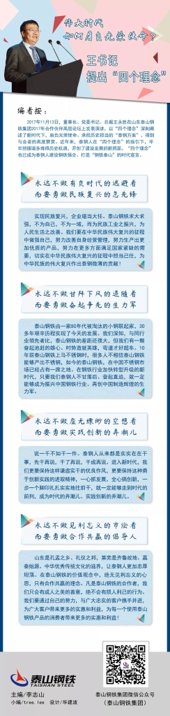 泰山钢铁由一家80年代被淘汰的小钢联起家,30多年艰辛历程实现了今天的发展。我们深知,与同行业领先者比,泰山钢铁的差距还很大,但我们有一颗奋起追赶的雄心。时势造就英雄,弯道才好超车。10年前泰山钢铁上马不锈钢时,很多人不相信泰山钢铁能够产出不锈钢,如今的泰山钢铁,在中国不锈钢市场已经占有一席之地。在钢铁行业加快转型升级的新时代,只要我们泰钢人不甘落后、奋起直追,就一定能够成为振兴中国钢铁行业、再创中国制造辉煌的生力军。