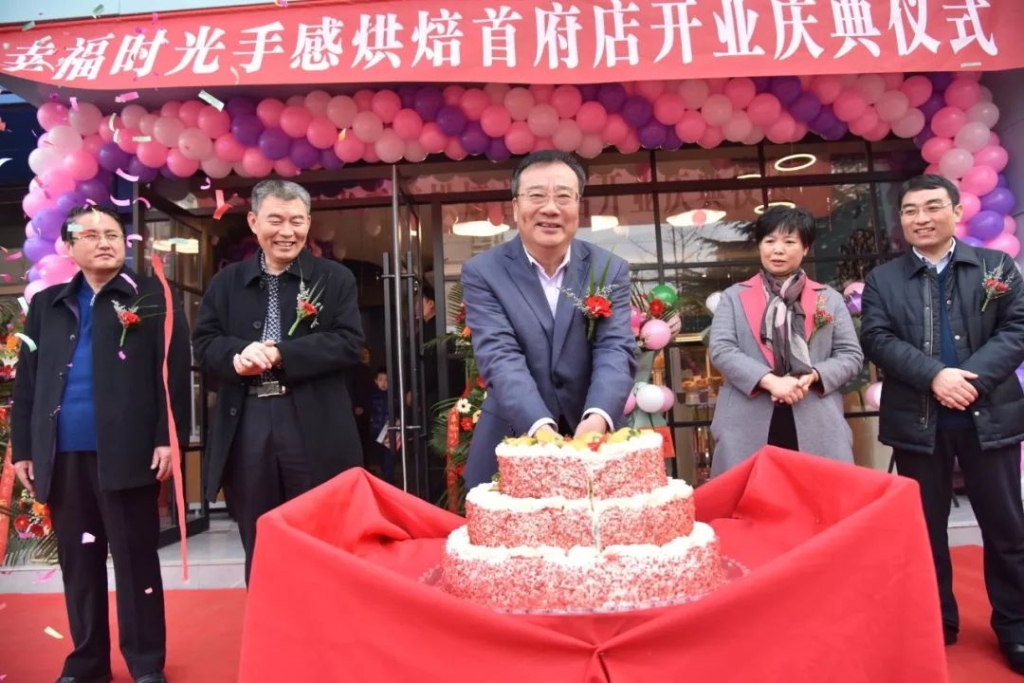 在热烈的掌声中,王永胜董事长为幸福时光手感烘焙首府店开业喜庆蛋糕操刀。