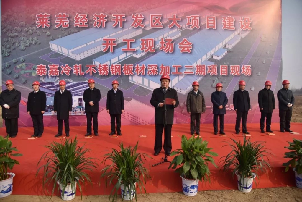 2月12日9点18分,泰山钢铁集团泰嘉冷轧不锈钢板材深加工二期项目开工现场会在泰钢不锈钢产业园隆重举行,区党工委书记张子信出席活动并宣布项目开工,区管委会主任李长春主持现场会,泰山钢铁集团公司董事长、党委书记、总裁王永胜作重要讲话。