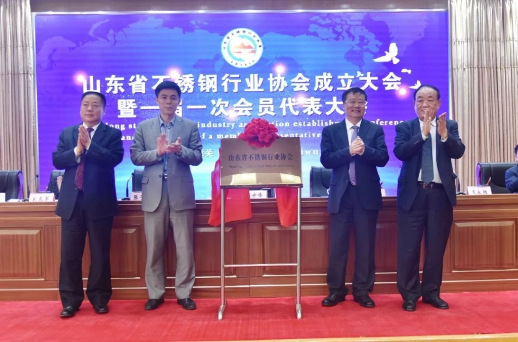 在热烈的掌声中,王董事长与姬升峰、刘复兴、张子信共同为山东省不锈钢行业协会揭牌。目前,这是全国首个省级不锈钢行业协会。
