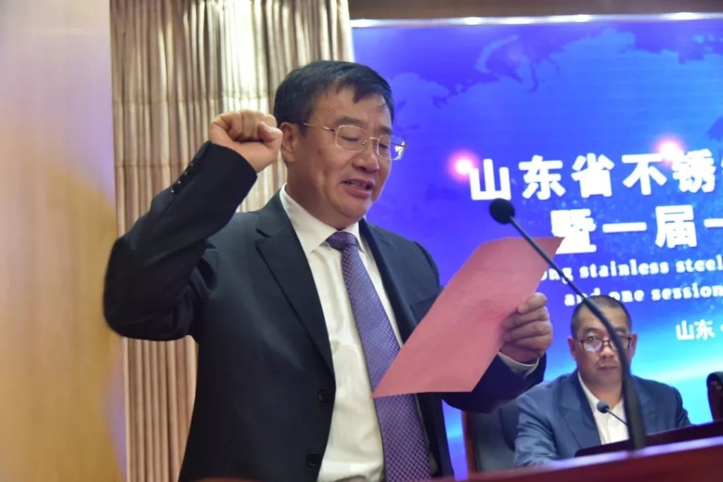 在当选协会会长之后,王董事长右手举拳,庄严宣誓。随后发表了重要讲话。他说,当前,中国高质量发展全新起航,山东新旧动能转换全面起势,机遇和挑战并存。特别是山东省先进钢铁制造产业基地发展规划启动实施,对于全面提升全省不锈钢行业发展水平、助推全省新旧动能转换具有重要意义。