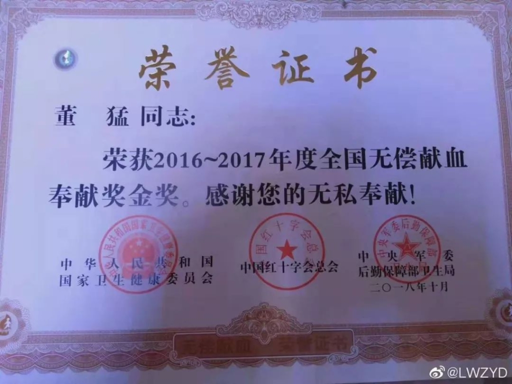 前几天,董猛收到了“2016~2017年度全国无偿献血奉献奖金奖”的荣誉证书,他却有些受宠若惊:“我只是个普通人,做了些我应该做的事。