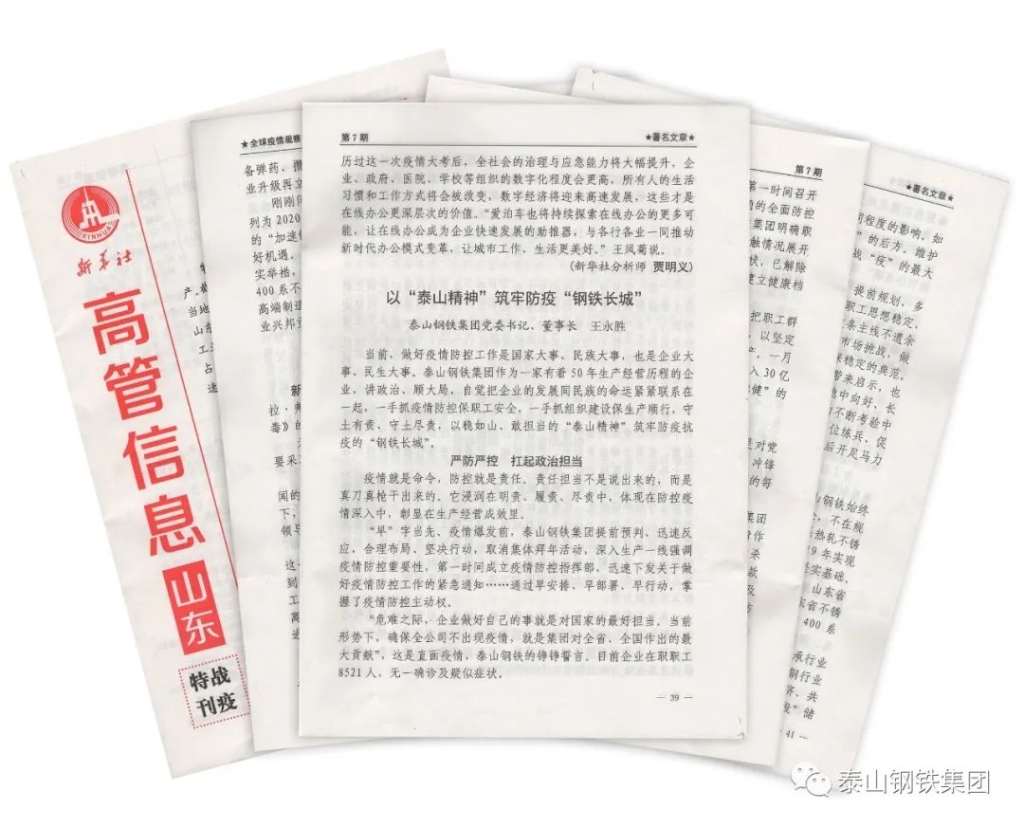 新华社《高管信息·山东》杂志2020年2月26日第7期(总第187期)刊发王董事长署名文章《以“泰山精神”筑牢防疫“钢铁长城”》。文章中写道,做好疫情防控工作是国家大事、民族大事,也是企业大事、民生大事,