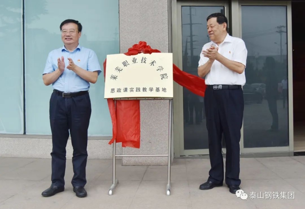 7月28日上午,在泰钢精神主题展览馆前,伴随着热烈的掌声,董事长、党委书记、总裁王永胜与莱芜职业技术学院党委书记董海燕一起为莱芜职业技术学院思政课实践教学基地揭牌。