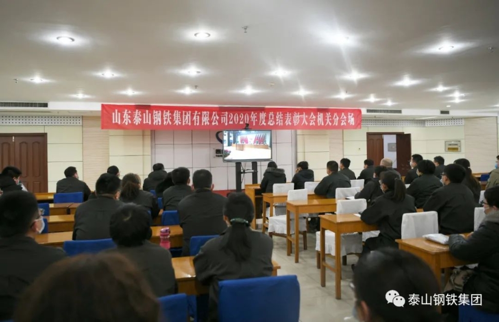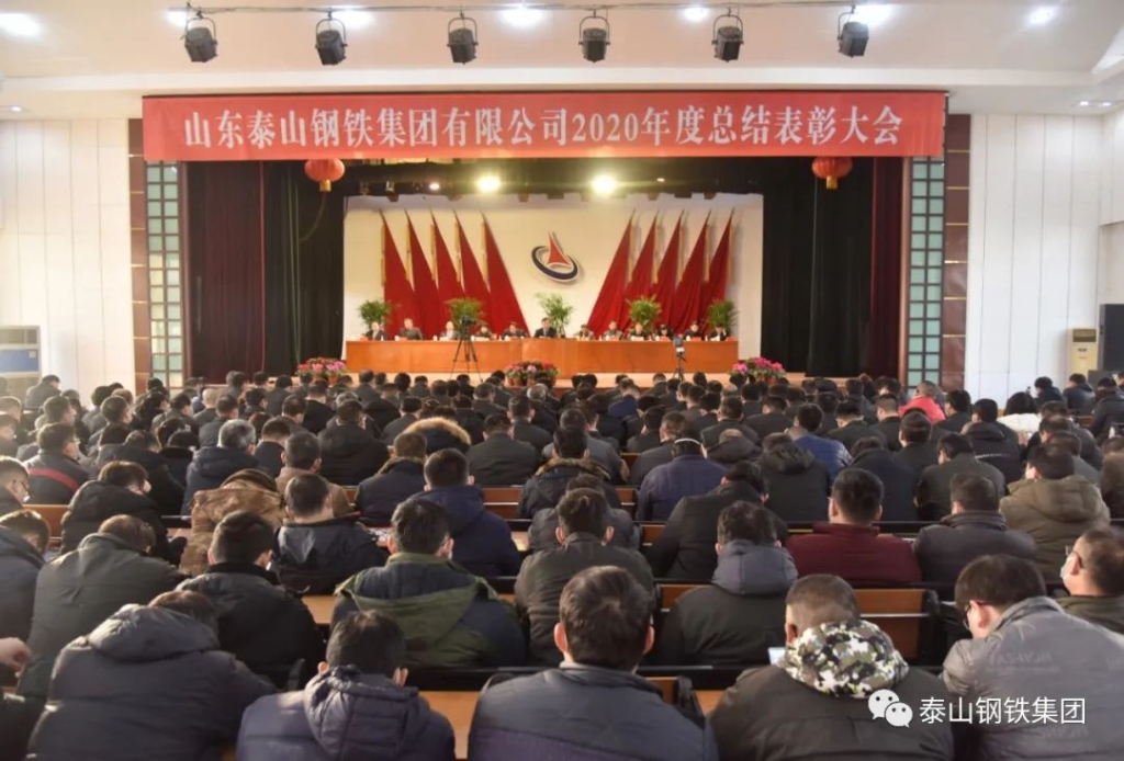 中心会堂内灯光璀璨,气氛庄重。悬挂在主席台正中的“泰山钢铁”标志熠熠生辉,十面鲜艳的红旗分列两侧。主席台台上,绿植青翠、鲜花娇艳。主席台上方,“山东泰山钢铁集团有限公司2020年度总结表彰大会”的会标,在灯光的辉映下格外醒目。