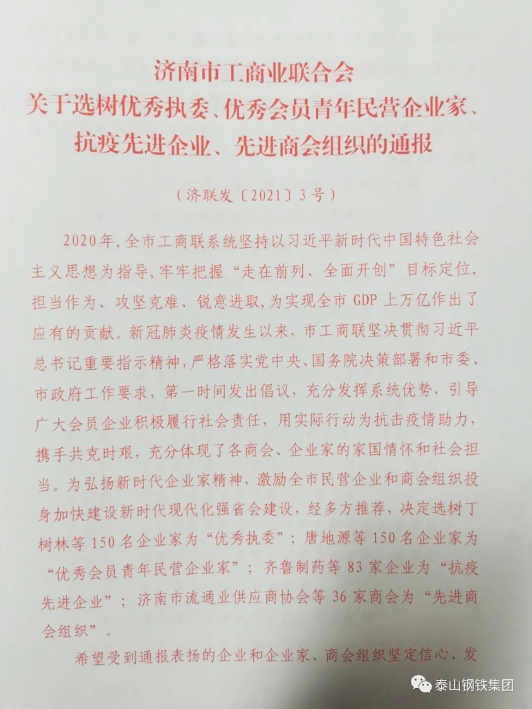 近日,济南市工商业联合会下发《关于选树优秀执委、优秀会员青年民营企业家、抗疫先进企业、先进商会组织的通报》,
