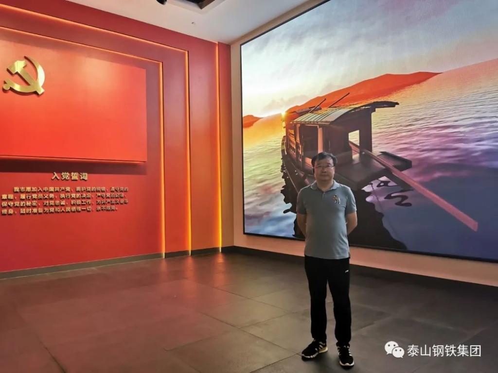 在庄严肃穆的党旗前,党员学员们重温入党誓词,表达了不忘初心、牢记使命的信念和决心。泰山钢铁集团党委书记董事长王永胜领誓。
