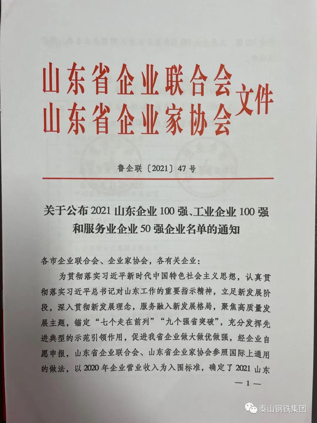 日前,山东省企业联合会、山东省企业家协会联合发布“2021山东企业100强、工业企业100强和服务业企业50强企业名单”。泰山钢铁集团入围“2021山东企业100强”,位列第36位;上榜“山东省工业企业100强”,位列第30位。