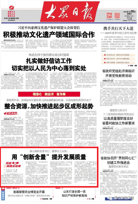 4月26日,《大众日报》在头版刊发新闻报道“泰山钢铁集团党委书记、董事长王永胜:用‘创新含量’提升发展质量”,介绍了王董事长带领集团探索高质量发展之路的“泰钢方案”。