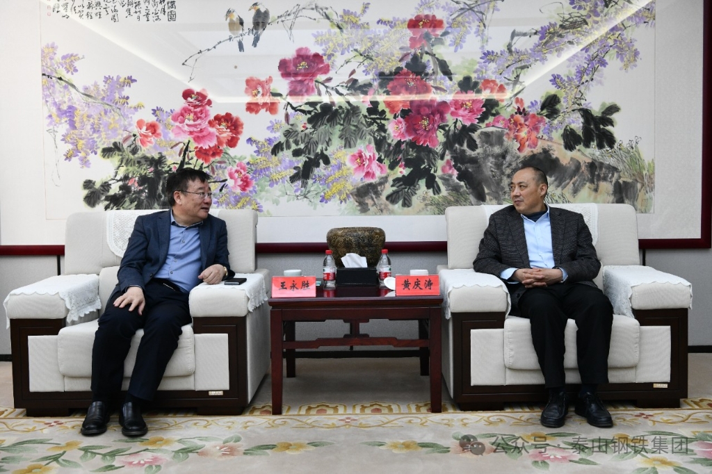 3月19日,市工商联党组成员、副主席黄庆涛带队到泰山钢铁集团调研。在办公楼贵宾室,全国人大代表,集团董事长、党委书记王永胜热情接待黄庆涛一行,并进行座谈。