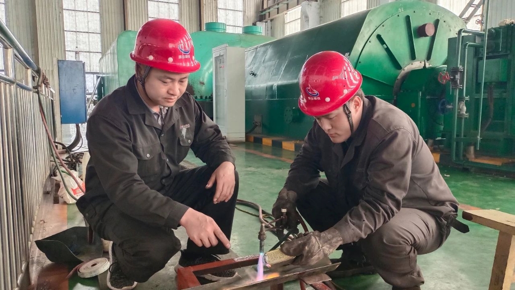 “侯班长经验丰富、技术过硬,许多难题到了他手里都能迎刃而解。”班员毕同洁评价道。有一回,维修九班更换完不锈钢精轧F3非负荷侧轴瓦,测试时发现非负荷侧顶起困难。侯安庆仔细用全方位水平仪测量后,发现轴的水平度整体往非负荷侧偏斜。若不解决,会影响设备运行稳定性;若要找正,就得重新拆卸调整,大概率会延误生产进度。于是,他凭借丰富的工作经验精确计算出水平误差,把相应厚度的垫片安装在非负荷侧轴瓦座上,将轴的水平度调整到了标准范围,保障了设备的正常运行。还有一次,在进行不锈钢飞剪减速机高速轴轴承更换时,由于减速机各部件体积庞大,拆解工作困难重重。侯安庆仔细查看图纸,结合设备结构,焊接制作了两件拆除工装和φ110套头,帮助大家在规定时间内完成了轴承更换任务。