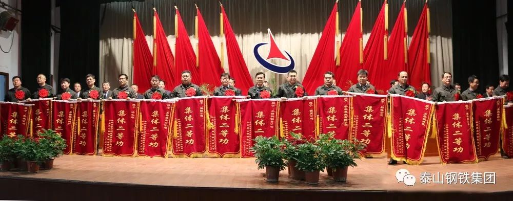 今天的中心会堂气氛庄严热烈。中心会堂内灯火辉煌,主席台上方悬挂着“山东泰山钢铁集团有限公司2017年度总结表彰大会”的会标,主席台帷幕中央“泰山钢铁”标志高悬,十面红旗分列两侧。