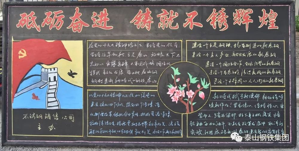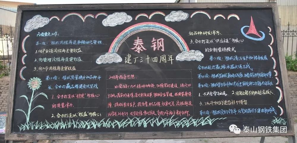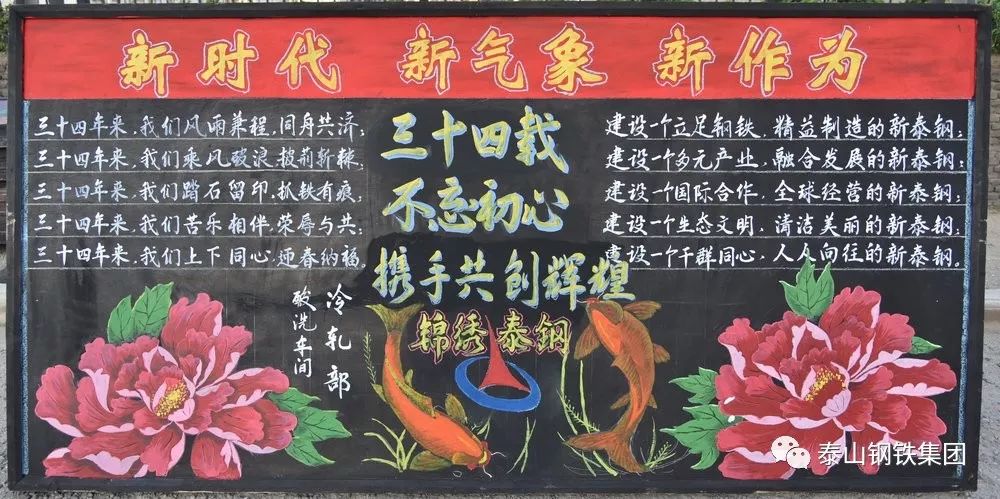 但是,泰山钢铁集团的钢铁汉子们不仅能百炼钢,亦能绕指柔!今年4月20日是泰山钢铁集团恢复生产34周年纪念日,为庆祝这一历史时刻,回顾和讴歌34年的创业历程,自4月18日起,泰山钢铁集团开展了黑板报展评庆祝活动。来自分厂、部室的钢铁汉子们纷纷用手中的画笔为这幸福的日子粉刷彩色的祝福……