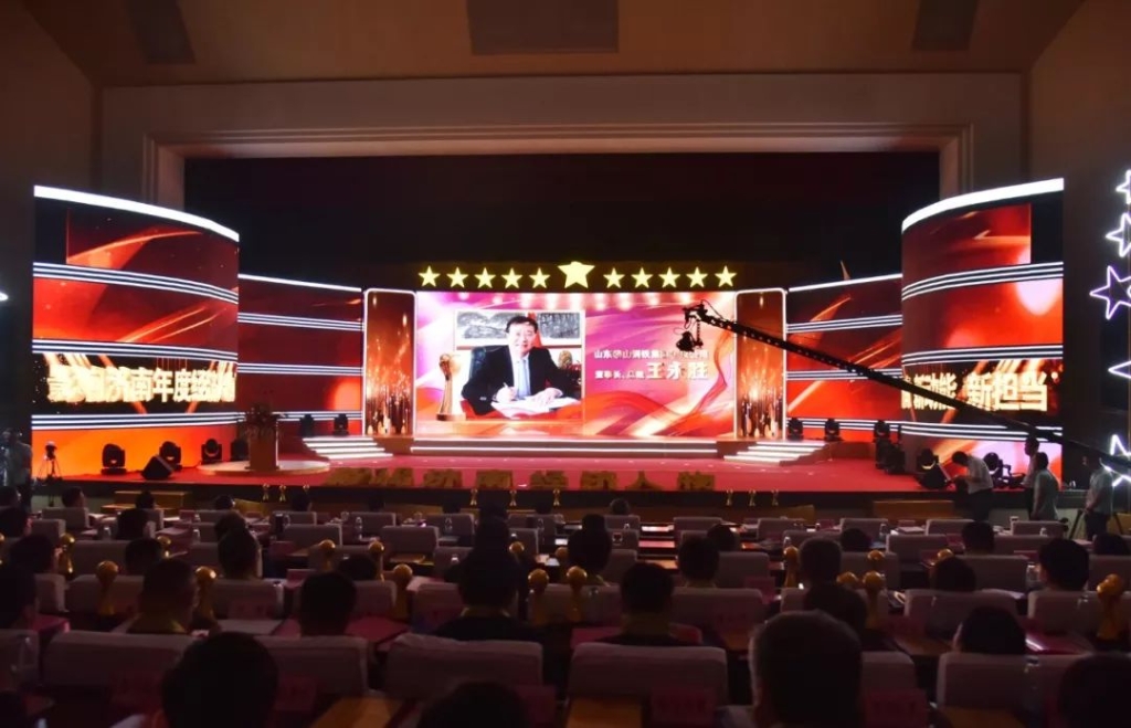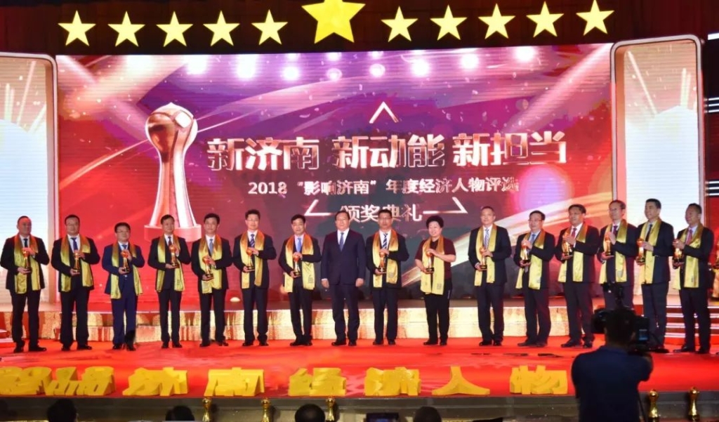 在激昂的乐曲声中,大会相继公布了2018年“影响济南”年度创业人物、创新人物及 “影响济南” 首届名牌名企获奖名单,王董事长荣获2018“影响济南”年度经济人物称号。王董事长精神抖擞走上舞台,从王忠林书记手中接过沉甸甸的荣誉奖杯。