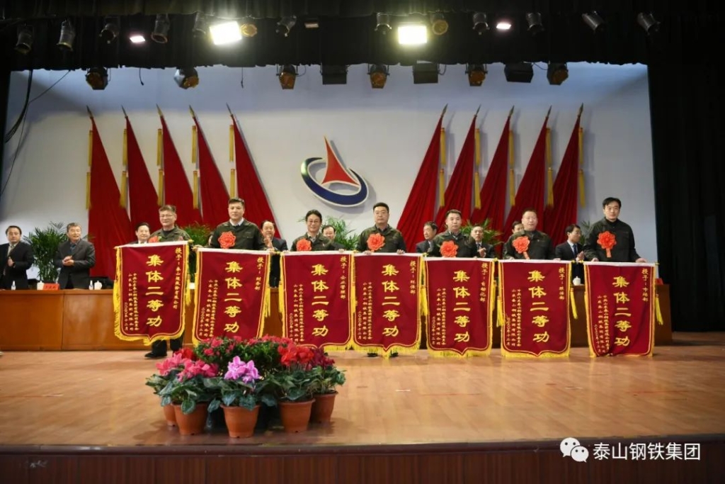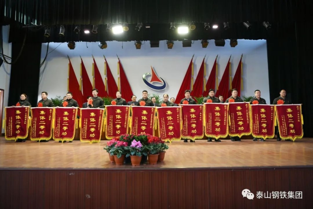 中心会堂内灯光璀璨,气氛庄重。悬挂在主席台正中的“泰山钢铁”标志熠熠生辉,十面鲜艳的红旗分列两侧。主席台台上,绿植青翠、鲜花娇艳。主席台上方,“山东泰山钢铁集团有限公司2020年度总结表彰大会”的会标,在灯光的辉映下格外醒目。
