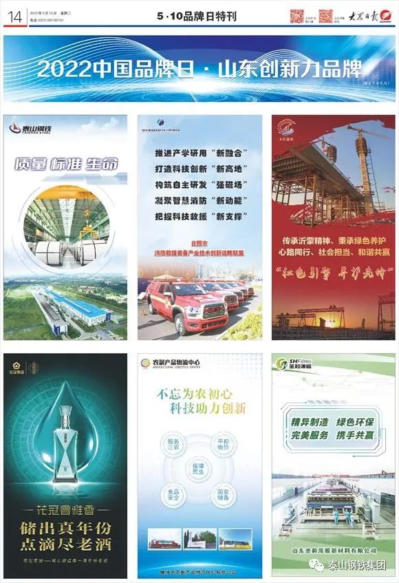 在大众日报社推出的“2022 中国品牌日•山东创新力品牌”展示活动中,泰山钢铁集团光荣上榜,被评为“创新山东 品牌力量——2022中国品牌日•山东创新力品牌”。