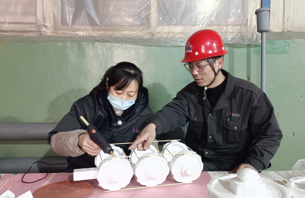 在同事眼里,耿哲的那股钻研劲儿不仅用在解决难题上,也体现在日常的提质提效中。比如白模制作,传统手工切割效率低,误差过大。耿哲就利用车间的废旧钢材,自己画图、切割、打磨,做了两套简易工装:一套用于快速定位白模,一套用于精准切割。这两件“土发明”投入使用后,单件白模的制作效率提高了40%,现在已经在车间全面推广。